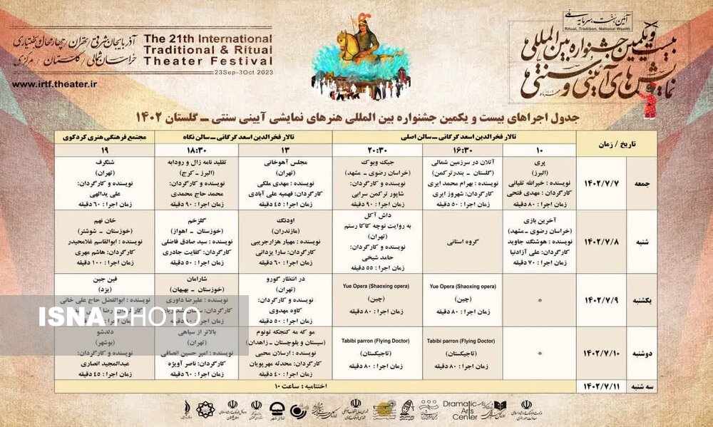 وی با بیان اینکه سالن اصلی تالار فخرالدین اسعد گرگانی و سالن نگاه این مجموعه در شهر گرگان و مجتمع فرهنگی هنری شهر کردکوی به عنوان محل برگزاری نمایشها معرفی شده است، ادامه داد: نخستین نمایش از استان البرز رأس ساعت ۱۰ صبح جمعه ۷ مهرماه در سالن اصلی تالار فخرالدین اسعد گرگانی اجرا خواهد شد.