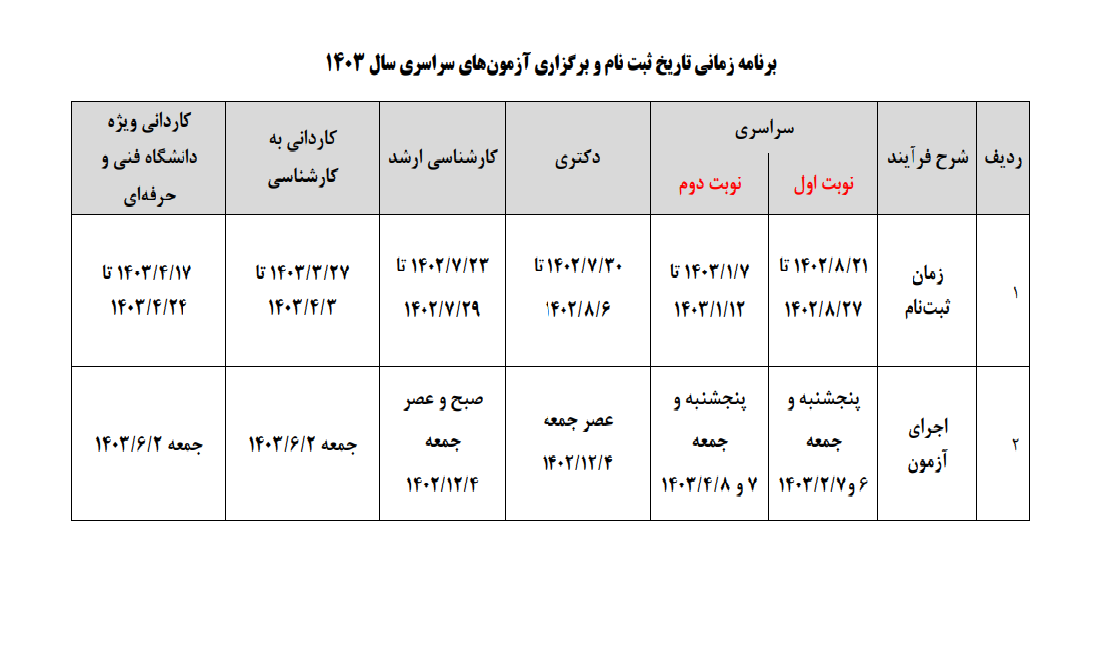 همچنین ثبت نام مرحله دوم کنکور نیز از ۷ فروردین ماه سال آینده آغاز می شود و تا ۱۲ فروردین ادامه دارد. این آزمون نیز روزهای ۷ و ۸ تیرماه سال ۱۴۰۳ برگزار می شود.